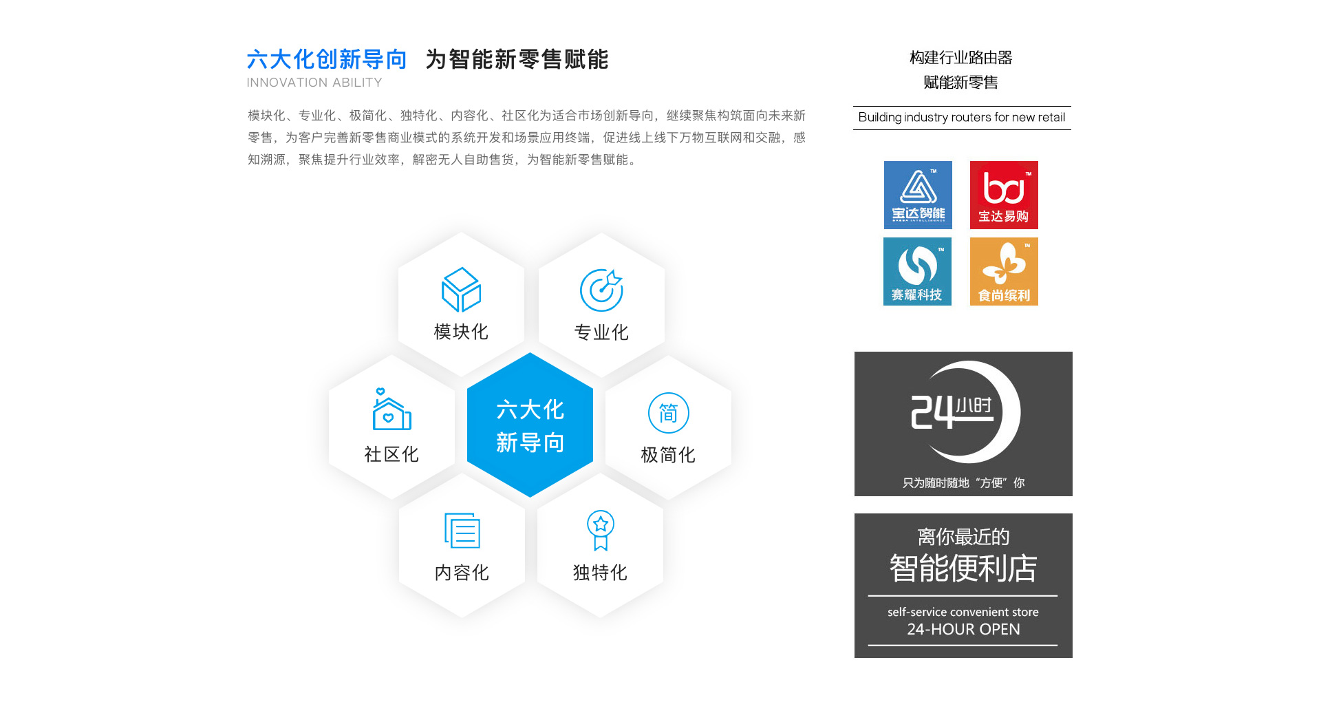 ? ? ? ?寶達(dá)智能科技公司是一家擁有自助售貨終端系列產(chǎn)品的研發(fā)、制造與銷售的高新技術(shù)企業(yè)。18年來在互聯(lián)網(wǎng)、云計算機領(lǐng)域積累豐富的成功經(jīng)驗。公司圍繞電控、觸摸交互、移動互聯(lián)、云計算機等核心技術(shù),塑造成為國內(nèi)技術(shù)領(lǐng)先型企業(yè)。依托智能交互式平臺的領(lǐng)先技術(shù)在智能自動售貨機上的完美展現(xiàn),為廣大用戶提供高品質(zhì)的設(shè)備和全方位的服務(wù)。寶達(dá)智能自動售貨機具有良好的企業(yè)形象和商業(yè)信譽,擁有國內(nèi)先進(jìn)技術(shù)的應(yīng)用體系及自動售貨機制造的能力,應(yīng)對市場需求快速反應(yīng),滿足客戶的多方位需求,與客戶一起,打造更大的市場價值。