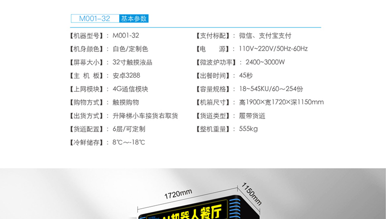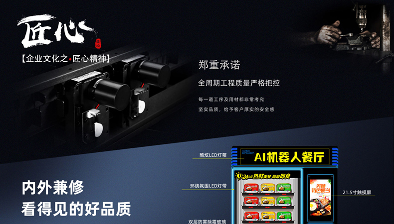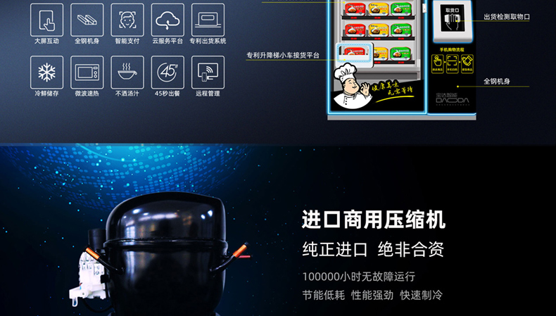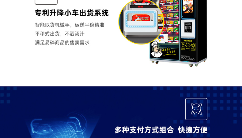 訂購標配:(8℃~-18℃)制冷、加熱系統(tǒng)+數(shù)碼電子標簽+智能防盜門+智能電動取貨門+升降梯小車接貨右取貨+21.5寸液晶屏+觸摸屏+安卓3288主板+微信及支付寶支付