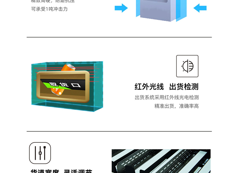 容量規(guī)格:6個托盤 / 9條履帶式貨道 / 54種產品(108-840件)